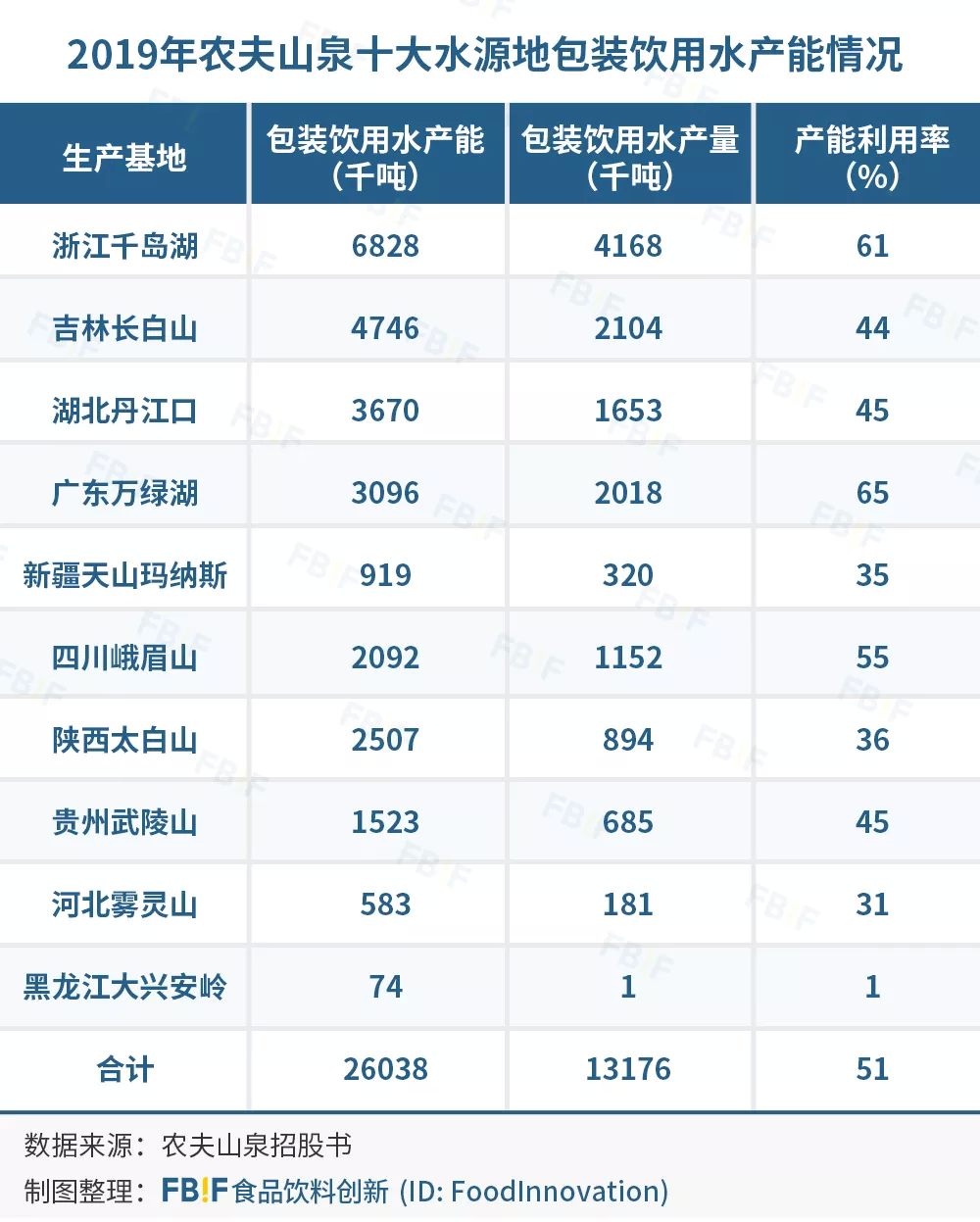 同时我们注意到,农夫山泉的十大水源地中,除了浙江千岛湖和广州万绿湖两处,其余八处水源地的产能利用率都还不到60%[3]。农夫山泉为未来的瓶装水业务留出的增长空间,用“充足”已经不足以形容。