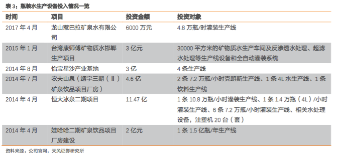 农夫山泉说过“我们不生产水,只是大自然的搬运工”。那想要“搬水”,就要建立生产线,对水进行过滤等基本处理和包装。瓶装水厂商一般需要配置过滤杀菌设备、包装设备等生产线。这些生产线设备初期投入规模较大,例如一套较为先进的德国克朗斯矿泉水生产线设备造价约8000 万元。