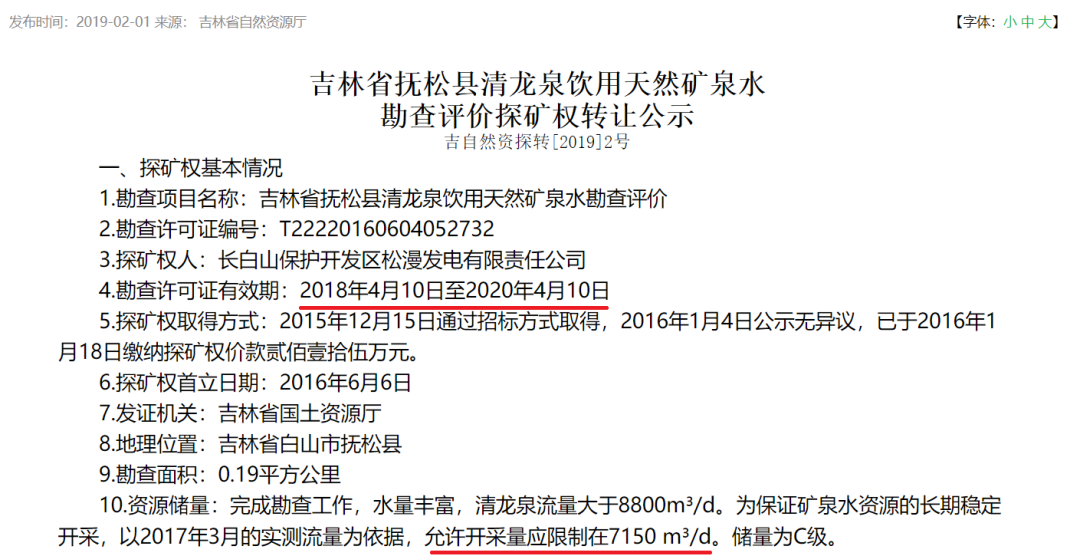 根据吉林省自然资源厅官方网站上的探矿权转让公示,该矿产可供开采的水储量约为261万吨(每天不超过7150吨,转让时的探矿权还有1年才到期)。