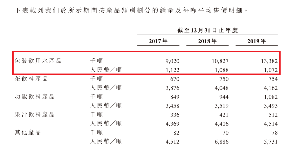 根据农夫山泉的招股书,2019年它卖了1338.2万吨饮用水、108.2万吨功能饮料、75.4万吨茶饮料、51.2万吨果汁饮料,再加上咖啡、苏打水等其他产品,总共收入240.21亿元。