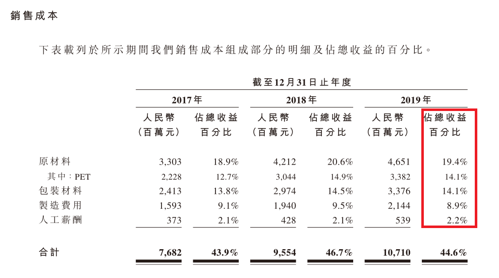 以饮用水+饮料的合并口径计算,2019年,原材料成本占营收的19.4%,剔除生产瓶身的PET,糖、果汁、水等成本占总营收的5.3%。