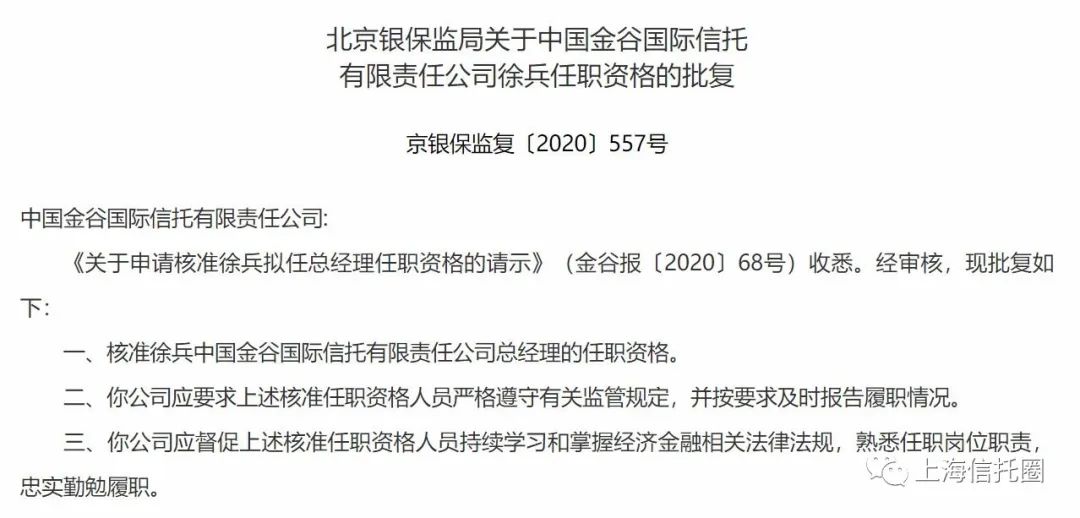 2020年9月8日,由徐兵正式出任金谷信托总经理一职。