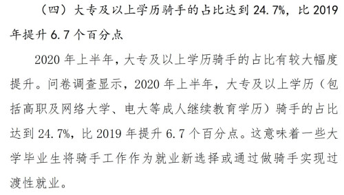 2020年,大专以上学历的骑手占比达到了24.7%——大专毕业,去做外卖骑手,已经丝毫不罕见。人人都说道旁苦李,可事实证明,外卖骑手,已经是那么多可选的李子里相对比较甜的那一颗了。