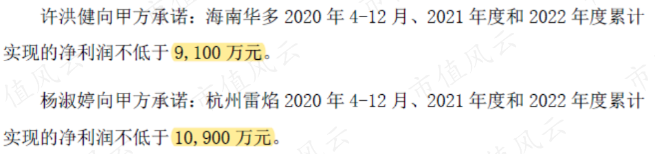 根据公告,海南华多的原老板许洪健、杭州雷焰的原老板杨淑婷对各自公司未来两年零9个月的业绩承诺分别为9,100万元,10,900万元。