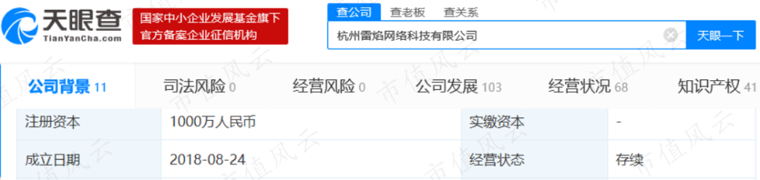 根据天眼查信息显示,杭州雷焰成立于2018年8月24日,海南华多成立于4月18日。