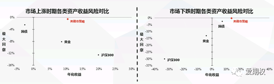 分市场上涨阶段和下跌阶段两种情况来看。当股市上涨的时候,黄金和国债这类的资产表现相对比较一般。期权类做市策略在这段时间会呈现比较低的风险水平(甚至低于了国债类的),总体的收益虽然不及沪深300指数,但单位风险的收益率还是比较高的。当股市下跌的时候,类做市策略的基金收益就会比较凸显,比如在18年这段时间,股指、黄金是表现比较差的,国债这种避险类的资产就表现比较突出,类做市策略按统计结果在这段时间是比国债的风险水平更低,收益又是远远超过国债的。