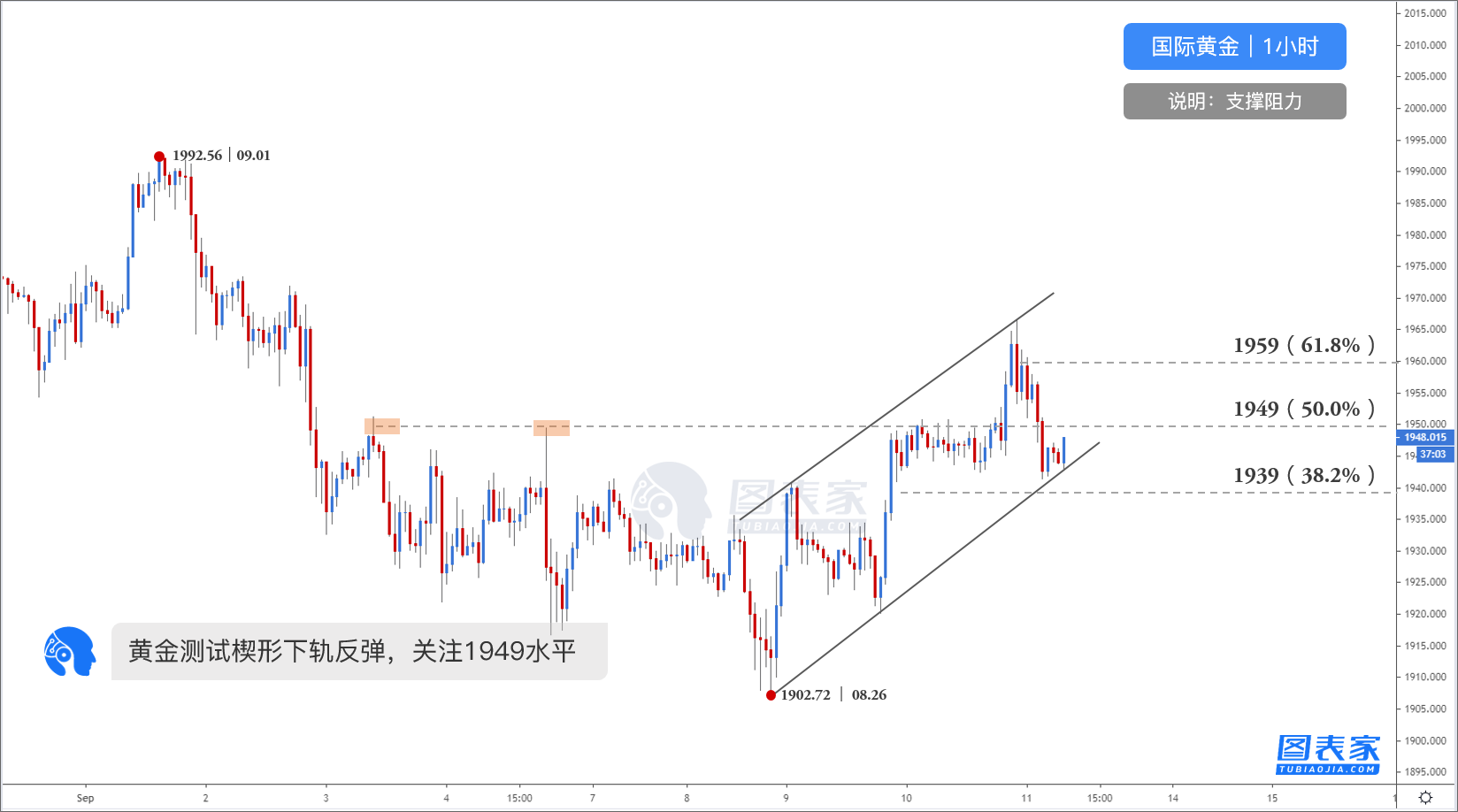图为黄金1小时走势,价格沿上升楔形走高,目前价格测试楔形下轨支撑后反弹,上方阻力见斐波那契50%回调位1949和前高组成的共振水平,突破该水平则见斐波那契61.8%回调位1959。