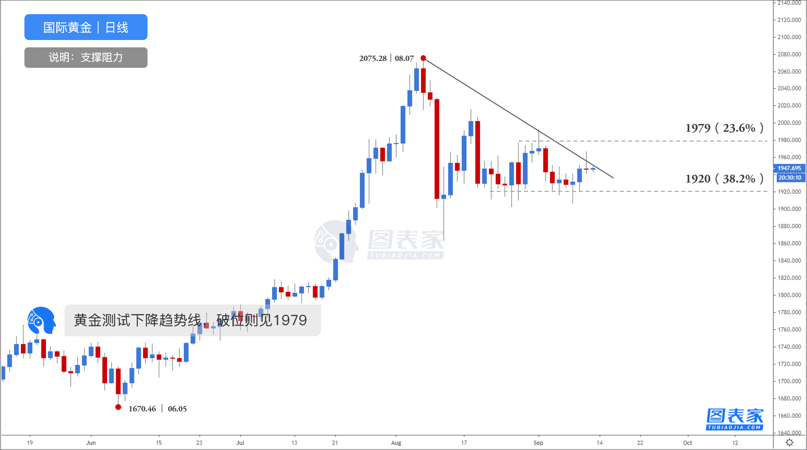 图为黄金日线走势,价格测试斐波那契38.2%回调位1920水平支撑后反弹,目前正在测试下降趋势线阻力,若该阻力破位,则上方阻力见斐波那契23.6%回调位1979.