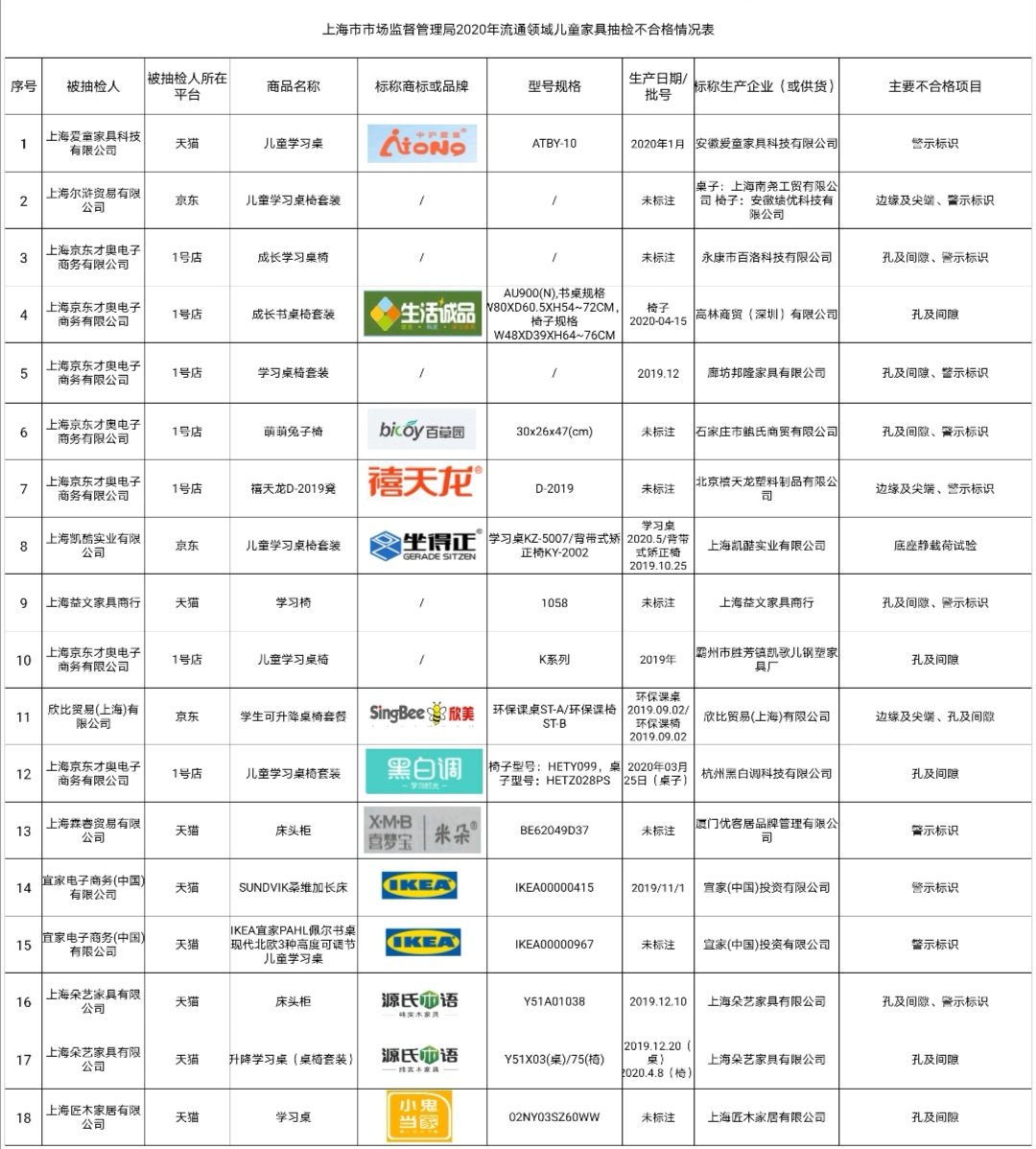 “上海市场监管”微信公号9月11日消息,近期,上海市场监管局集中组织执法力量对天猫、京东、1号店3个网络交易平台销售的25批次儿童家具进行了市场检查和质量抽查,经检测,有18批次不合格,不合格检出率为72%。不合格项目分别是边缘及尖端、孔及间隙、底座静载荷试验和警示标识四项。