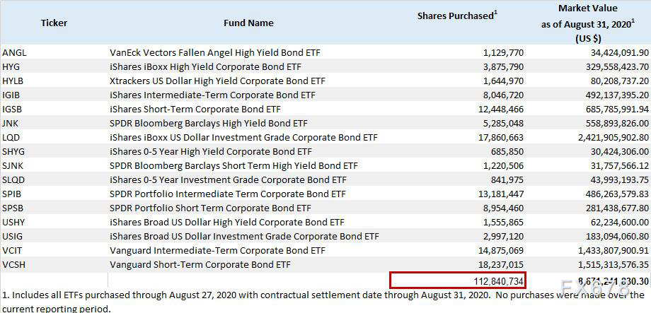 截至8月31日美联储更新其公司债券和ETF的持股量,在该报告中,我们发现整个月持有的ETF数量不变,而其ETF持有量市值实际上从87.36亿美元下降了6400万美元,至86.71亿美元。