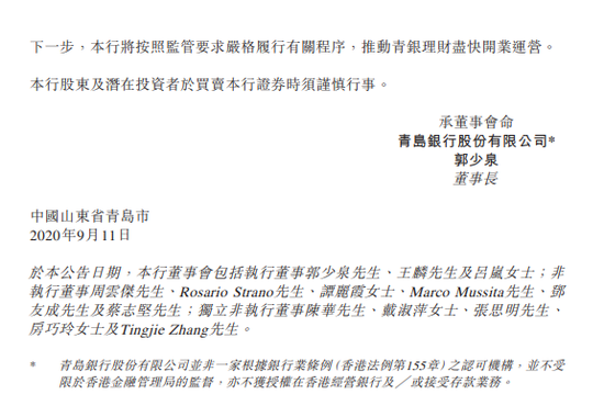 9 月 11日消息,青岛银行发布公告称,该行今日收到《青岛银保监局关于青银理财有限责任公司开业的批复》(青银保监复[2020]408号),银保监会青岛监管局已批准该行全资子公司青银理财有限责任公司开业。根据该批复,青银理财注册资本为人民币10亿元,注册地为山东省青岛市,主要从事发行公募理财产品、发行私募理财产品、理财顾问和谘询等资产管理相关业务。