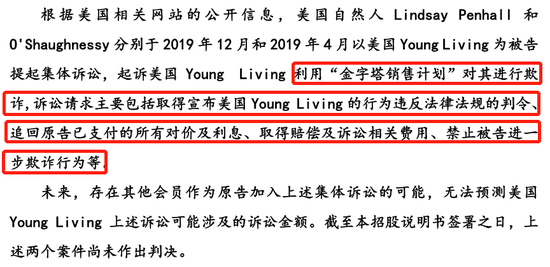 招股书披露,美国自然人 Lindsay Penhall 和O‘Shaughnessy 分别于 2019 年 12 月和 2019 年 4 月以美国 Young Living 为被告提起集体诉讼,起诉美国 Young Living 利用“金字塔销售计划”对其进行欺诈,诉讼请求主要包括取得宣布美国 Young Living 的行为违反法律法规的判令、追回原告已支付的所有对价及利息、取得赔偿及诉讼相关费用、禁止被告进一步欺诈行为等。