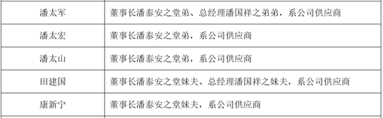 还有6个供应商是实际控制人、董事长潘泰安的堂弟、妹夫、堂妹夫。