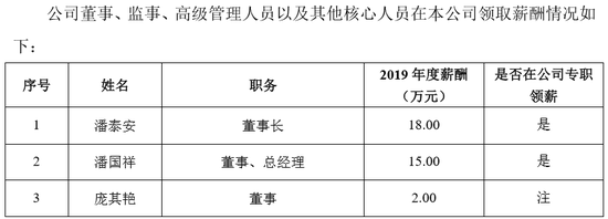 2019年,董事长年薪18万元,董事总经理年薪15万元,董事、实控人庞其艳2019年5月之后停止领取薪酬,董事兼董事会秘书年薪16万元,董事副总经理李俊鹏年薪16万元,监事会主席年薪7万元、监事陈波年薪11万元,副总经理邱华年薪16万元、财务总监年薪12万元、枸杞工程院副院长年薪10.77万元。