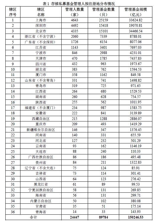 再者就是深圳地区,截至8月底,深圳的私募管理人为4492家,管理基金数量为15418只,管理基金规模为19070.81亿元。