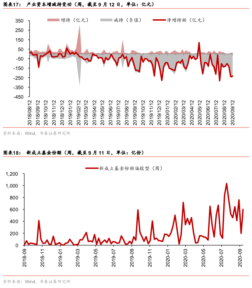 上周北向资金延续高波动,累计净流出5.8亿,流入医药,流出电子/通信/家电;上周新成立偏股型基金602亿份,场内股票型ETF增加149亿份,均环比显著反弹;杠杆资金:上周融资净卖出188亿,两融成交占比跌至8.2%,延续7.10以来的热度回落态势;产业资本:上周净减持额233亿, 环比小幅收敛但仍处于年内高位。9.11首批科创50 ETF获批,预计增量 资金在100亿元左右。我们认为VIX+AH溢价高位或继续压制外资短期流 入,基金+ETF发行高热度下,短期定价权或继续由外资转向公募资金。