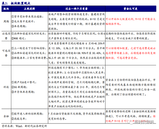 建议开始布局金融周期。7月的风格只是月度的补涨,不是真正的风格切换,9月后有可能进入真正的风格切换。重点关注有色、化工、银行、券商、汽车、家电。
