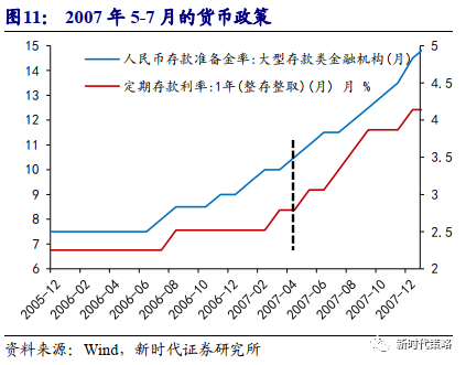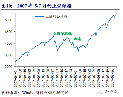 (4)第三次震荡:2007年5-7月。2007年3-5月,上证综指持续涨了一个季度,垃圾股暴涨,经济和上市公司盈利均维持不断超预期的趋势。5-7月市场迎来调整,第一个重要利空是5月30日财政部决定上调印花税,指数剧烈连续调整了一周。之后随着三大报口气缓和、证监会批准了4只新基金等事件,股市反弹到前期高点。但6月下旬-7月又出现了新的调整,主要利空是加息预期。7月中加息落地,股市开始新的上涨。