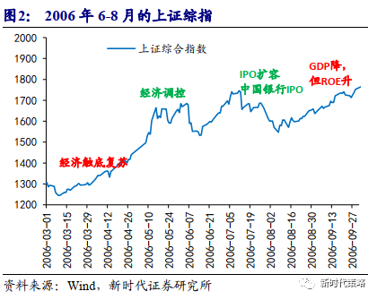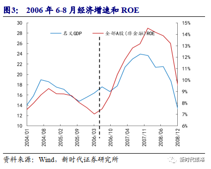 (2)第一次震荡:2006年6-8月。2005年12月-2006年5月,上证综指持续涨了半年,期间基本面层面最大的变化是经济拐点确立,经济进入上行周期,虽然上市公司盈利直到2006年中报才确立拐头,但各类宏观指标在2005年Q3已经全面拐头,并持续改善到了2006年上半年。由于经济调控,经济的回升在2006年Q2被打断,但是事后来看,调控只带来了的经济一个季度的下行,后续经济继续高速增长,期间上市公司ROE逐季改善,毫无调整。