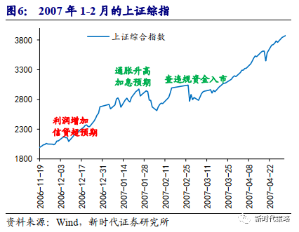 (3)第二次震荡:2007年1-2月。2006年8月-2007年1月,上证综指又一次持续涨了半年,之前的经济调控并没有压制住经济,经济继续加速增长,上市公司利润大幅增长,信贷火爆。由此带来的新问题是通胀,2007年1月,股市开始担心通胀,加息预期回升。但是加息也没改变经济上行的趋势,对经济的影响小于2006年6月的经济调控。