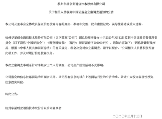 值得注意的是,今年3月13日,华星创业披露公告,因涉嫌短线交易,证监会决定对公司副总经理李嫚立案调查。