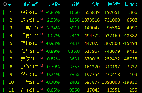 热点栏目9月15日,国内期市早盘涨多跌少,能化品分化,甲醇涨近4%,纯碱跌近5%,玻璃跌近3%;农产品涨跌互现,豆一涨逾2%,棉花涨近2%,苹果跌逾2%,菜粕跌近1%;有色飘红,沪铅、沪锌、沪镍涨逾2%;黑色系多数下跌,铁矿、螺纹跌近1%,动力煤强势涨逾1%。