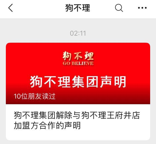 今早(9月15日),狗不理集团通过官方微信发布声明回应该事表示: