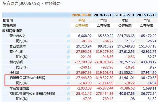 Wind数据显示,东方网力2017年、2018年归母净利润尚有3亿多元,但2019年出现巨亏,归母净利润为-32亿元,同比大降1114.99%。同时,2020年中报显示,归母净利润同比下降143.90%。