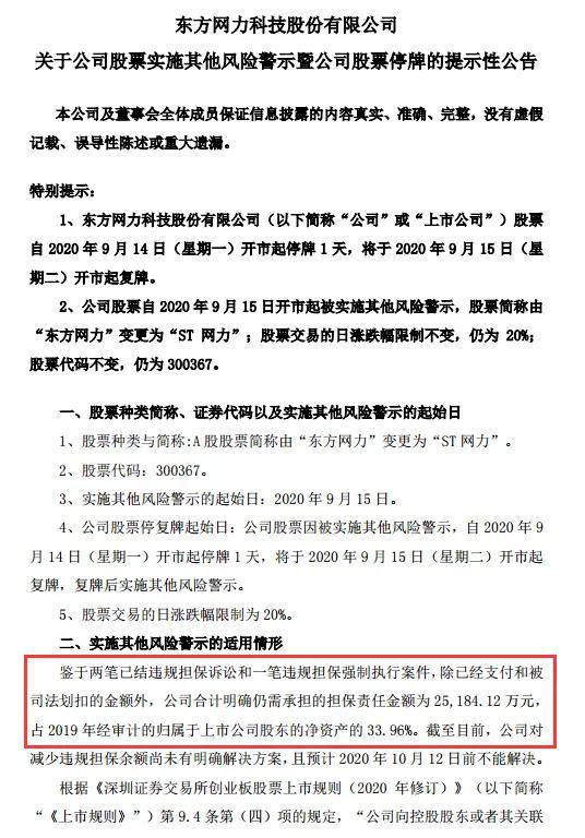 东方网力的ST原因与上面两家不同。公司公告显示,鉴于两笔已结违规担保诉讼和一笔违规担保强制执行案件,除已经支付和被司法划扣的金额外,公司合计明确仍需承担的担保责任金额为25,184.12万元,占 2019 年经审计的归属于上市公司股东的净资产的33.96%。截至目前,公司对减少违规担保余额尚未有明确解决方案,且预计2020年10月12日前不能解决。