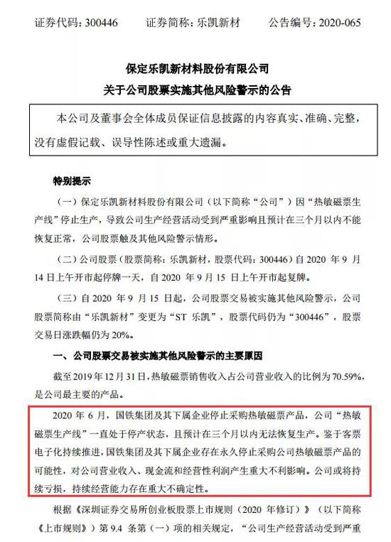 乐凯新材公告称,截至2019年12月31日,热敏磁票销售收入占公司营业收入的比例为70.59%,是公司最主要的产品。2020年6月,国铁集团及其下属企业停止采购热敏磁票产品,公司“热敏磁票生产线”一直处于停产状态,且预计在三个月以内无法恢复生产。鉴于客票电子化持续推进,国铁集团及其下属企业存在永久停止采购公司热敏磁票产品的可能性,对公司营业收入、现金流和经营性利润产生重大不利影响。公司或将持续亏损,持续经营能力存在重大不确定性。