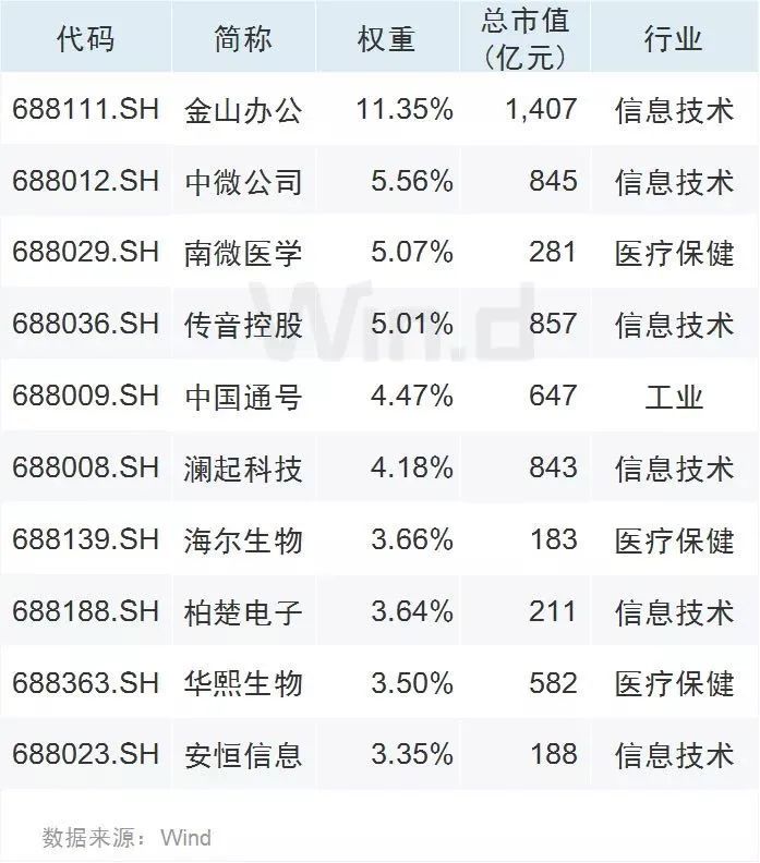 从50只成分股权重分析来看,前10家公司权重占比累计高达50%。其中,金山办公、中微公司、南微医学、传音控股位居指数前四大重仓股,权重位居5%-12%之间,四家公司均为信息技术、医疗行业头部公司。
