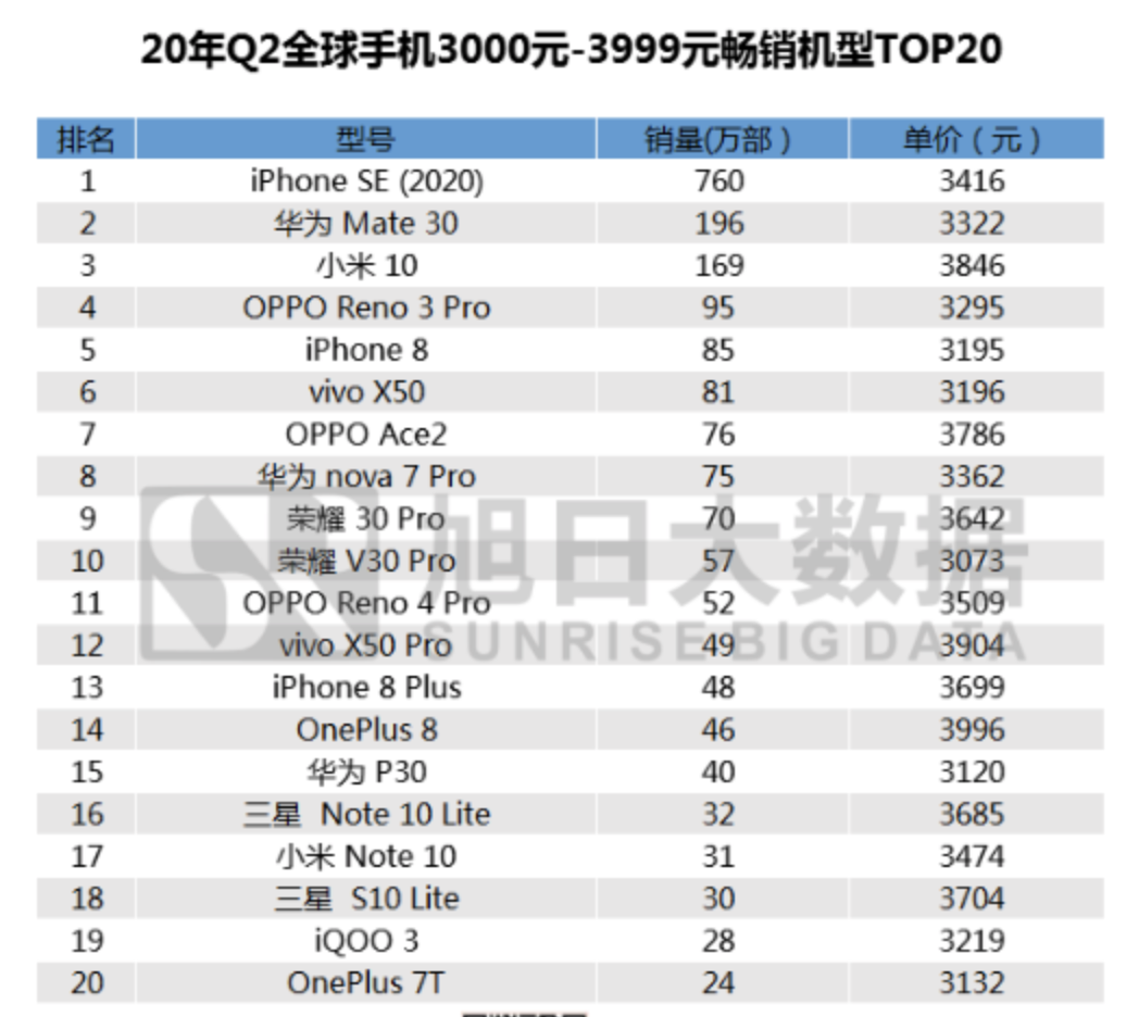 但这并不意味着苹果可以顺利拿下华为让出的市场份额。小米、OPPO、vivo等国产手机品牌近几年都在加入高端化阵营,且市场格局正在发生变化。由第一手机界研究院和旭日大数据发布的报告显示,2020年第二季度,全球4000元以上手机畅销机型TOP 20中,前12款手机由苹果、华为和三星瓜分,小米10 Pro排名第13,此外,OPPO和一加也各有一款手机登上榜单。