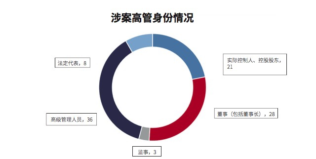 以涉案高管的身份来看,上市公司实际控制人或者控股股东、董事以及高级管理人员涉嫌刑事犯罪的仍居多数,而监事本身职务是监督上市公司的正常生产经营活动,所以涉刑犯罪并不多。具体数量上,实际控制人或者控股股东有21人,法定代表人有8人,高级管理人员有36人,监事有3人,董事(包括董事长)有28人。