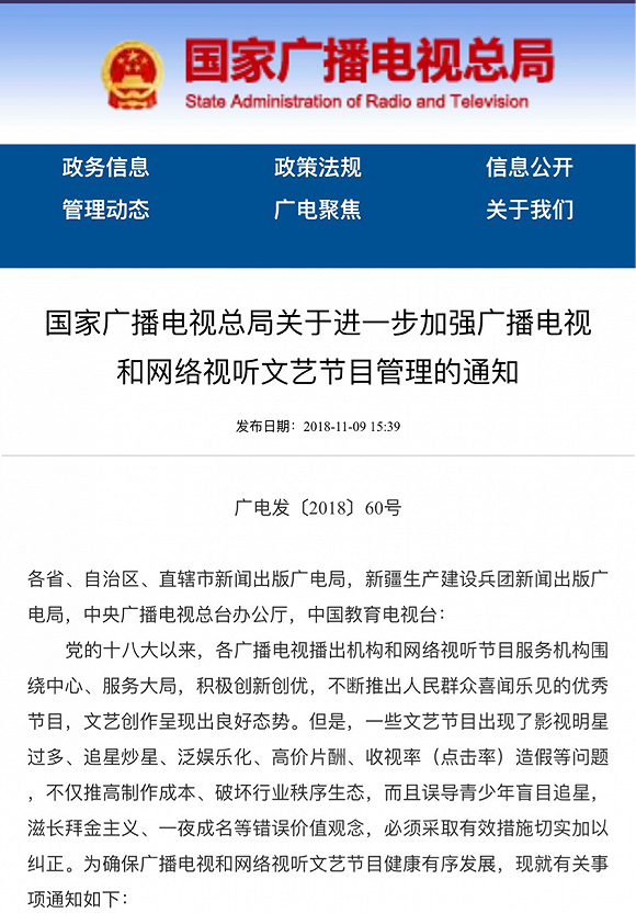 2018年,国家广播电视总局发布了《关于进一步加强广播电视和网络视听文艺节目管理的通知》。通知规定每部电视剧网络剧(含网络电影)全部演员片酬不超过制作总成本的40%,其中主要演员不超过总片酬的70%。