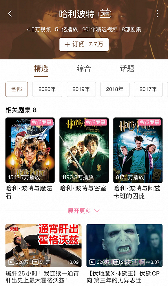 李旎所说的“很好的氛围和土壤”表现在B站拥有海量的同人二创作品和UP主。B站的视频剪辑和影视剧解说一直是内容创作领域持续输出的优秀代表,例如今年购入的《哈利·波特》系列、《指环王》系列中,《哈利·波特》频道已经达到5.1亿播放,拥有7.7万个订阅,4.5万个二创视频产出,话题的讨论度和浏览量一直居高不下。