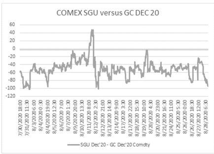 图为COMEX上海金期货合约和COMEX 黄金期货(GC)之间的价差