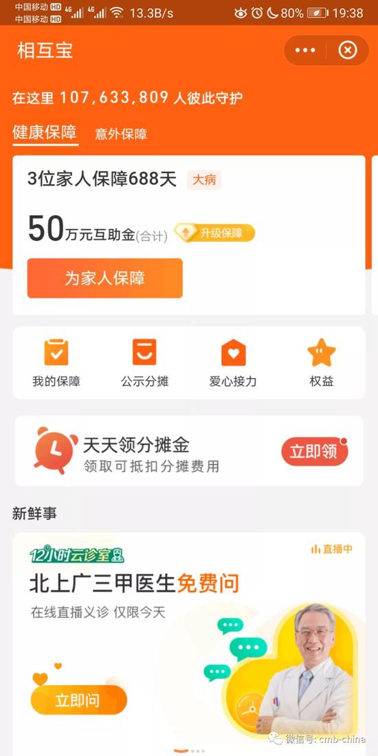 打开支付宝app,依次点击:我的->相互宝->为家人保障。