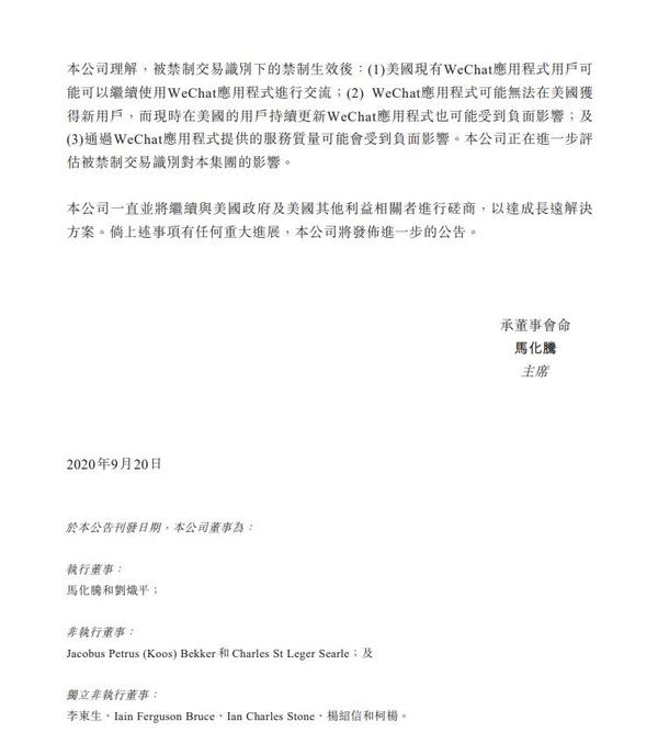凤凰网财经9月20日讯,腾讯港交所公告称,被禁制交易识别下的禁制生效后,美国现有WeChat应用程式用户可能可以继续使用WeChat应用程式进行交流;WeChat应用程式可能无法在美国获得新用户,而现时在美国的用户持续更新WeChat应用程式也可能受到负面影响;及通过WeChat应用程式提供的服务质量可能会受到负面影响。