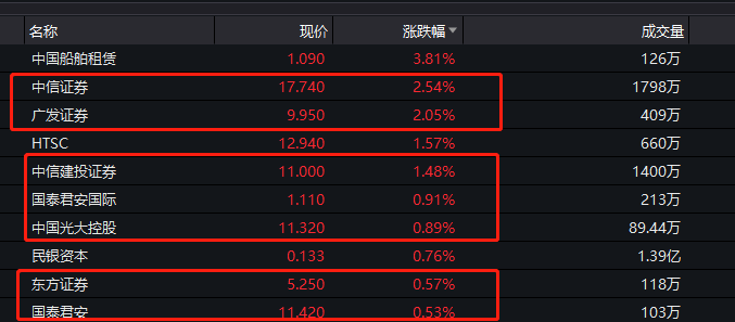 当天港股市场,中资券商股集体走前;中信证券、中信建投、招商证券港股先后涨超3%以上,临近午盘,涨幅略有回落。