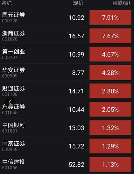 而在A股市场,券商股同样迎来大幅高开。早盘开盘几分钟后,国元证券、浙商证券快速冲上涨停,哈高科逼近涨停,第一创业、财通证券、中泰证券、中信建投、中银证券集体高开。随后,券商板块涨幅略有回落。