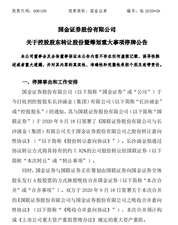 9月20日下午,国联证券、国金证券同日公告称,国联证券拟受让长沙涌金持有的国金证券约7.82%股份,同时国联证券向国金证券全体股东发行A股股票的方式换股吸收合并国金证券,股票双双停牌。