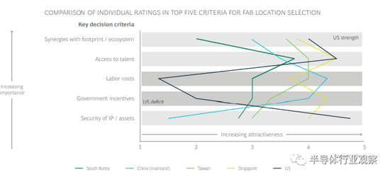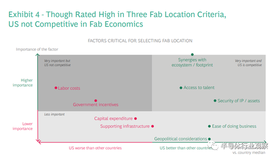 那么,为什么公司选择在美国境外建造晶圆厂呢?我们根据半导体行业的相关经验,与行业领导者进行的讨论,以及对参与制造的美国半导体公司的调查来确定:公司决定在何处建立新晶圆厂的关键标准,以及将美国与其他替代地点进行比较所得到的相对位置。(参见图4)