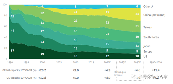 由于半导体对技术领先地位和国家安全的战略意义,许多国家现在更为关注其在半导体价值链中的地位。美国一直是半导体领域的全球领导者,在过去30年中,美国在全球半导体行业收入中所占份额为45%至50%。但是当前美国在半导体制造领域的份额正在下降,仅占全球装机容量的12%。1