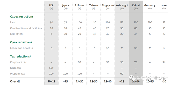 •资本支出。资本支出占美国TCO劣势的15%~20%。一家新工厂的资本支出中,约有一半用于由一小部分高度专业化的全球供应商提供的制造设备,因此各地区之间的情况预计将是相似的。建设成本占资本支出的20%~40%,差异较大。