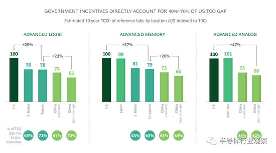 对于所考虑的每种类型的晶圆厂,我们已经分析了不同国家的前期资本支出,年度运营成本和政府激励措施。根据我们的分析,在所有三种类型的晶圆厂中,美国的晶圆厂的总拥有成本比中国台湾地区或新加坡的同等晶圆厂高约25%至30%。(请参见图表7)中国除了结构上较低的工资外,还提供了非常高的政府激励措施,这看起来甚至是更具成本竞争力。在美国,晶圆厂总拥有成本比中国大约高50%,甚至不算中国通过获得低于资本成本的信贷和股权所提供的融资成本的额外优势,经济合作组织(OECD)最近的一项研究运营与发展(OECD)表明这一点非常重要。10