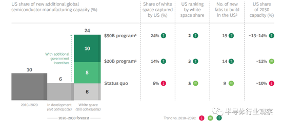 ·情景2——新增500亿美元政府激励计划。根据我们的模型,这样的计划可能会使美国成为中国以外新半导体产能的首选目的地。我们估计,美国将能够吸引总共19座晶圆厂,比目前多10座。这占未来10年进入市场的新产能的24%。较2010年~2020年的10%和目前的6%有大幅提升。这将导致美国在全球产能中的份额从2020年的12%增加到2030年的13%~14%,比按照现状预测的10%份额有了很大的提高。