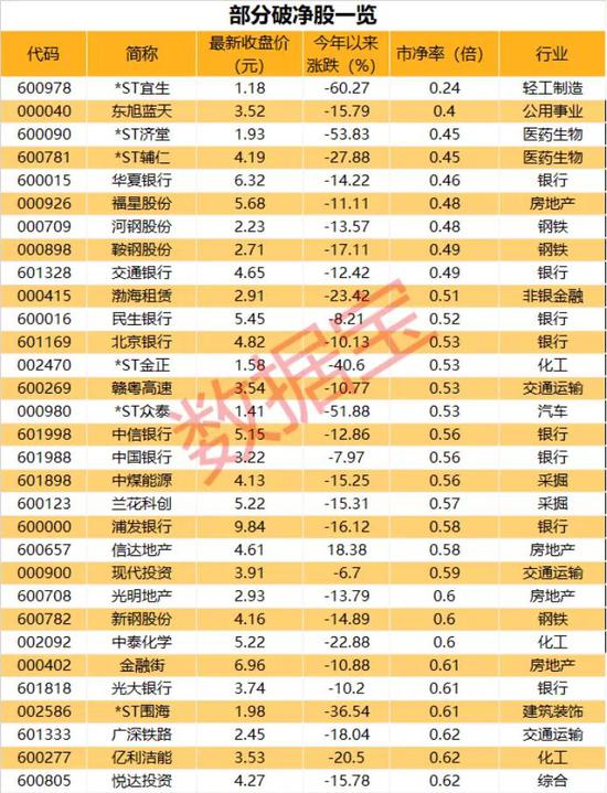 最新破净股名单来了!市净率最低仅有0.24倍,这个行业成破净高发地