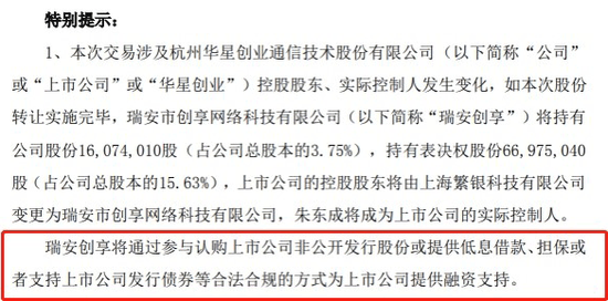 交易实施完成后,瑞安创享将持有华星创业1607.4万股(占总股本3.75%),合计享有公司15.63%表决权,上市公司的控股股东变更为瑞安创享,实际控制人变更为朱东成。