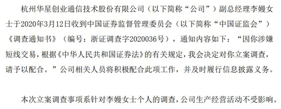 回顾来看,今年3月13日,华星创业披露称,因涉嫌短线交易,证监会决定对公司副总经理李嫚立案调查。此前,李嫚在2019年9月中旬就因多次买入、卖出公司股票而收到浙江证监局的警示函。