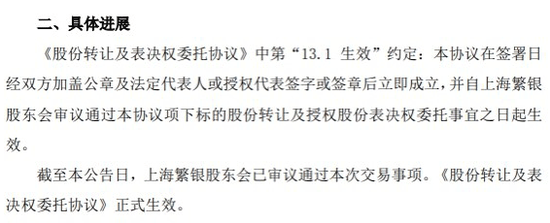 其次,上海繁银同意在委托期间内将其剩余持有但仍处于冻结状态的5090.1万股(占总股本的11.88%)及前述未完成交割的750.12万股的表决权全部委托给瑞安创享行使。
